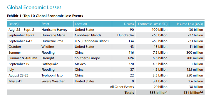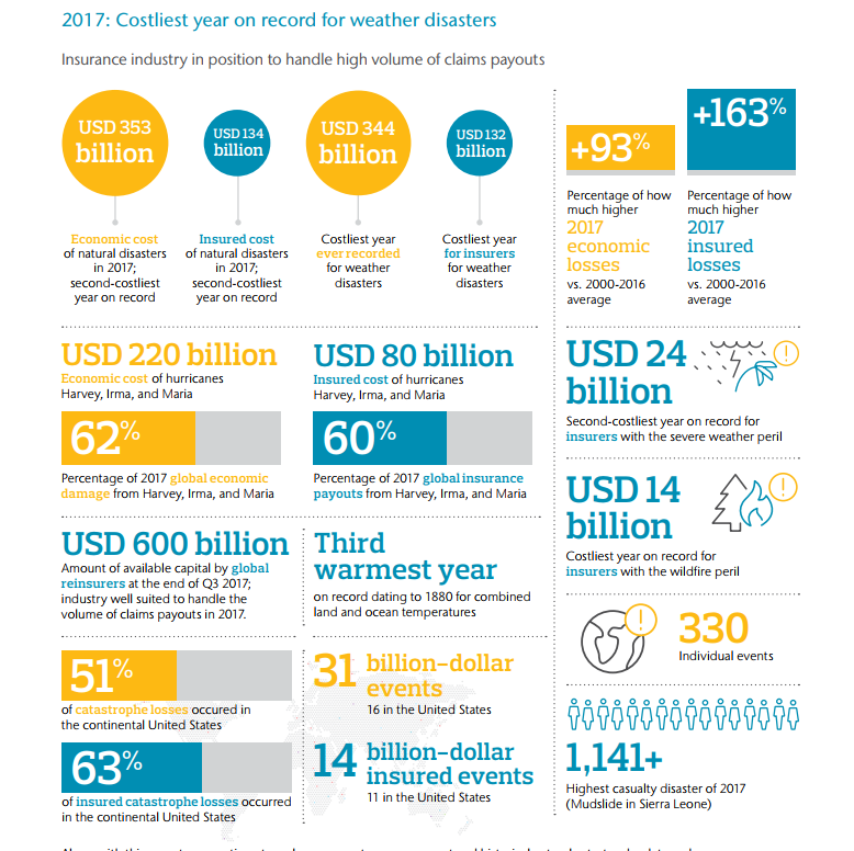 Γενικά το 2017 τα καιρικά φαινόμενα κυριάρχησαν προκαλώντας το 97% των ζημιών, δηλαδή 344 δις, για αυτό και θεωρείται το πιο δαπανηρό έτος για ζημιές από καιρικά φαινόμενα
