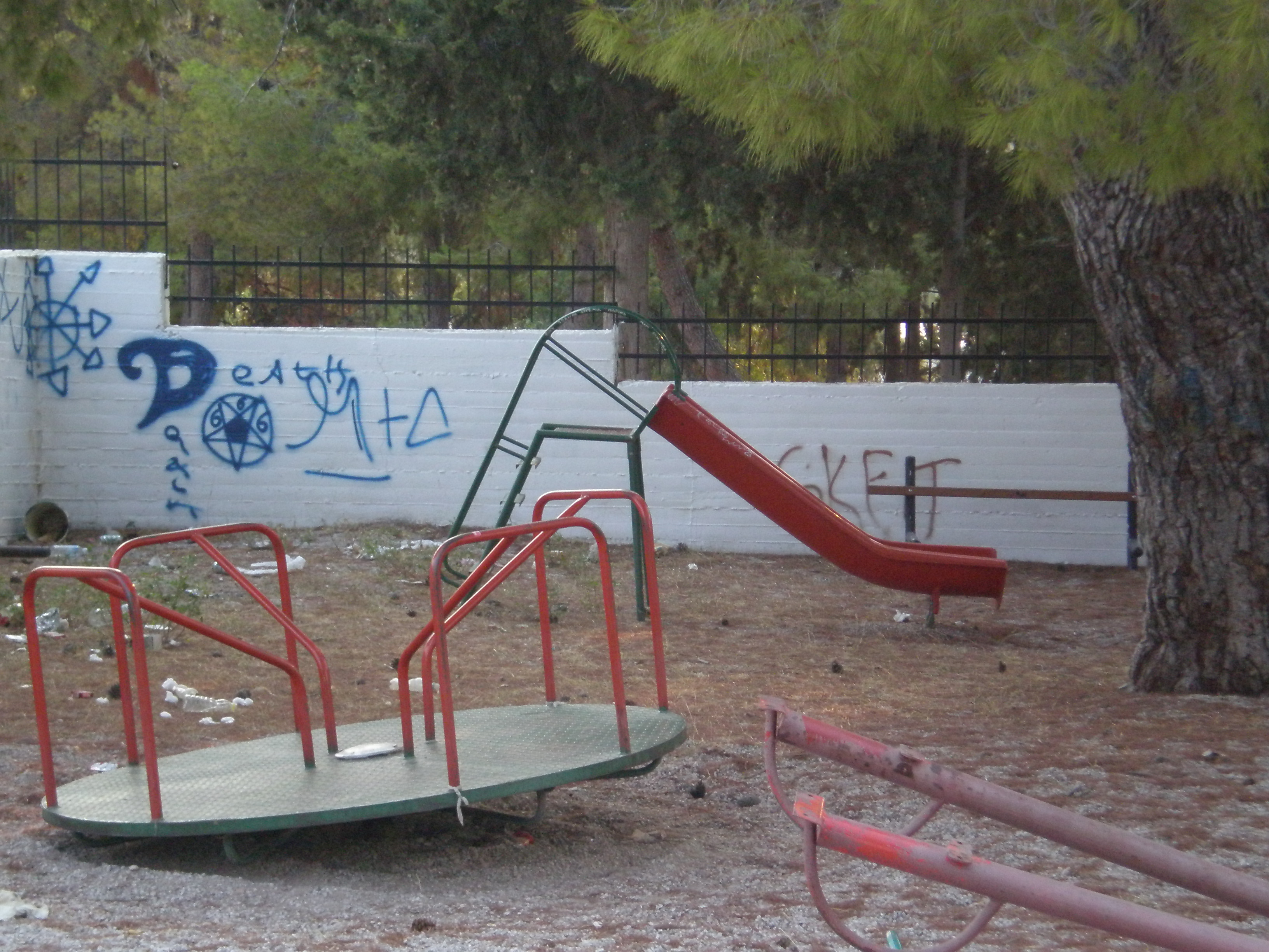 Σπασμένα ξύλα, σωλήνες που εξέχουν, κολόνες φωτισμού που είναι προσβάσιμες στα παιδιά και επιπροσθέτως έδαφος ακατάλληλο, που αυξάνει τις πιθανότητες ατυχήματος.
