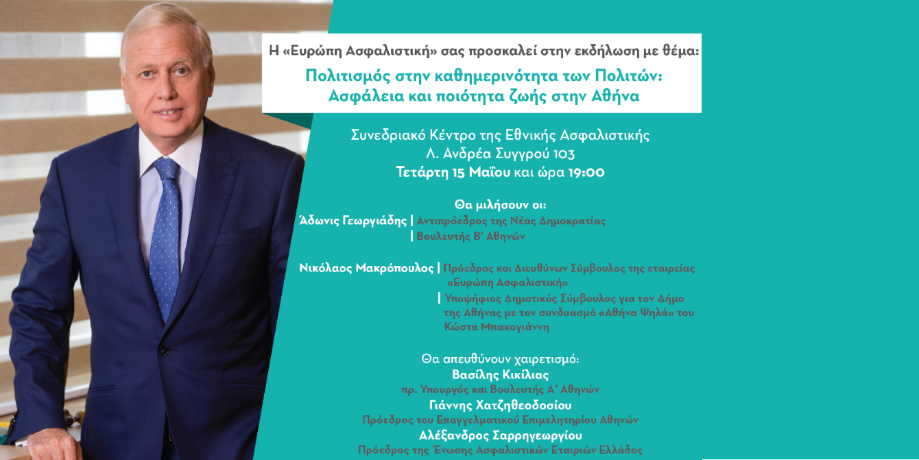 Η «Ευρώπη Ασφαλιστική» πραγματοποιεί εκδήλωση με θέμα «Πολιτισμός στην καθημερινότητα των Πολιτών: Ασφάλεια και ποιότητα ζωής στην Αθήνα», που θα πραγματοποιηθεί στο Συνεδριακό Κέντρο της Εθνικής Ασφαλιστικής, επί της Λ. Συγγρού 103, την Τετάρτη 15 Μαΐου και ώρα 19:00.