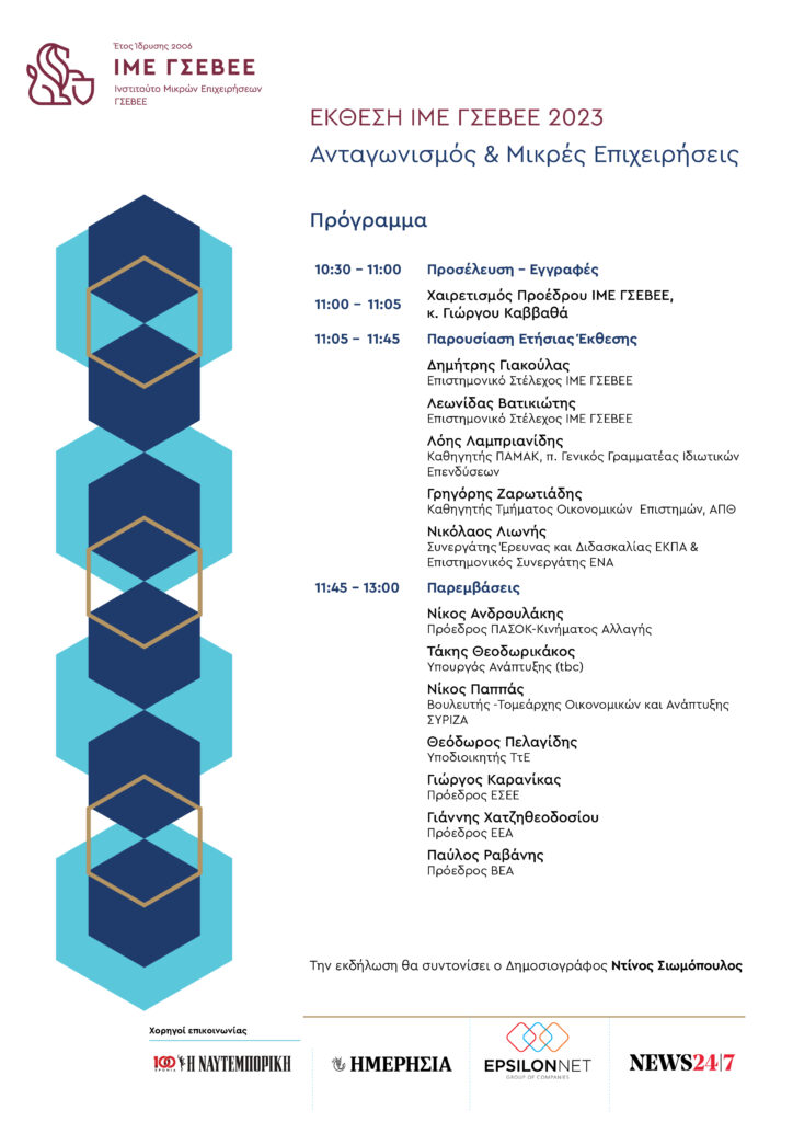 Η εκδήλωση θα διεξαχθεί στο Αμφιθέατρο της ΓΣΕΒΕΕ, Αριστοτέλους 46, και θα παραστούν εκπρόσωποι της πολιτικής, μεταξύ των οποίων ο Υπουργός Ανάπτυξης Τάκης Θεοδωρικάκος, ο Πρόεδρος του ΠΑΣΟΚ-ΚΙΝΑΛ Νίκος Ανδρουλάκης και ο βουλευτής του ΣΥΡΙΖΑ Νίκος Παππάς.