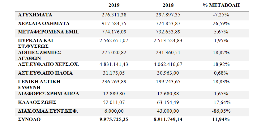 Συγκεκριμένα, τα μικτά εγγεγραμμένα ασφάλιστρα, ανήλθαν το 2019 σε 9.975.725,35 έναντι 8.911.749,14 του 2018. Στον πίνακα που ακολουθεί παρουσιάζονται, τα παραγωγικά αποτελέσματα της Εταιρείας ανά κλάδο ασφάλισης:
