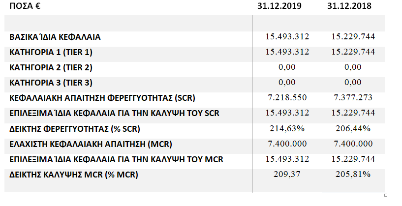 Για το έτος 2019, η Εταιρεία υπερκάλυψε το σύνολο των κεφαλαιακών απαιτήσεών της που απορρέουν από το πλαίσιο της Φερεγγυότητας ΙΙ.