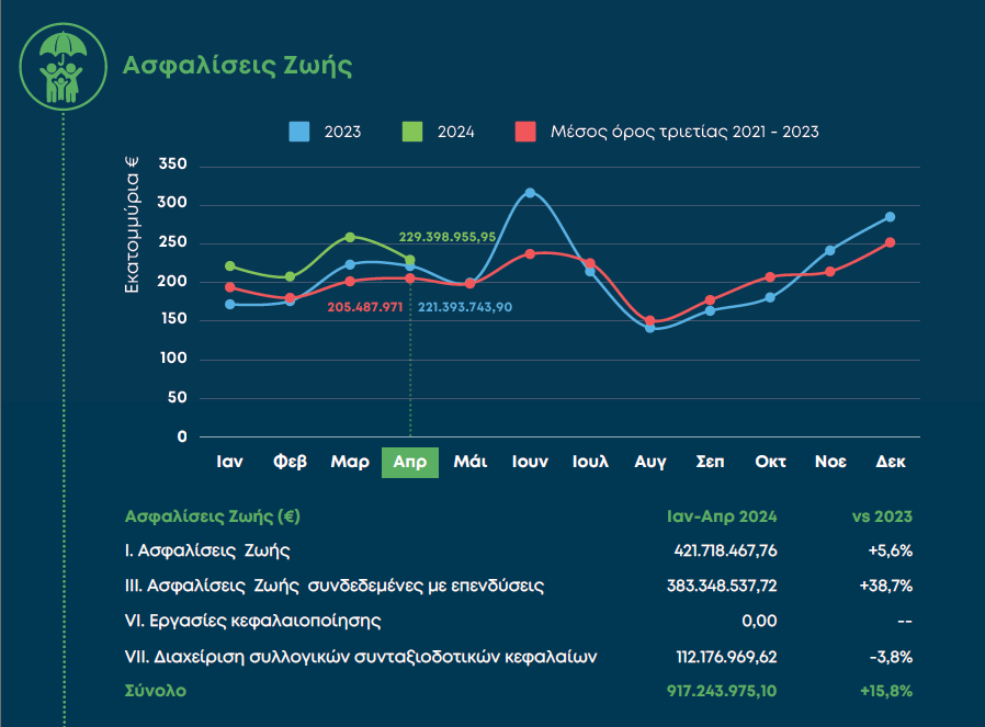 Παραγωγή που ανήλθε σε 1,8 δις ευρώ συγκέντρωσαν οι ασφαλιστικές εταιρείες την περίοδο Ιανουαρίου – Απριλίου 2024 σημειώνοντας αύξηση 13,2% σε σχέση με την αντίστοιχη περίοδο του 2023.