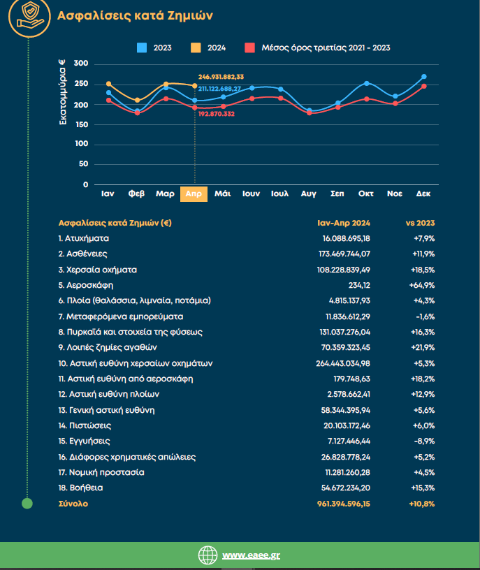 Αύξηση 15,8% κατέγραψαν οι ασφαλίσεις ζωής και 10,8% οι γενικές ασφάλειες. Στα συμβόλαια ζωής, σύμφωνα με τα στοιχεία της ΕΑΕΕ, ο κλάδος των ασφαλίσεων που είναι συνδεδεμένες με επενδύσεις έχει αύξηση 38,7%. Aύξηση 11,9% έχουμε στις ασφαλίσεις πυρός και 18,9 στα συμβόλαια για την ασφάλιση των χερσαίων οχημάτων.
