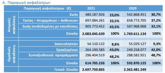 Τα αντίστοιχα ποσά νέων εργασιών του 2020 ήταν 703,3 εκατ. € στο σύνολο (εκ των οποίων 598,9 εκατ. € στις ατομικές και 104,4 εκατ. € στις ομαδικές).