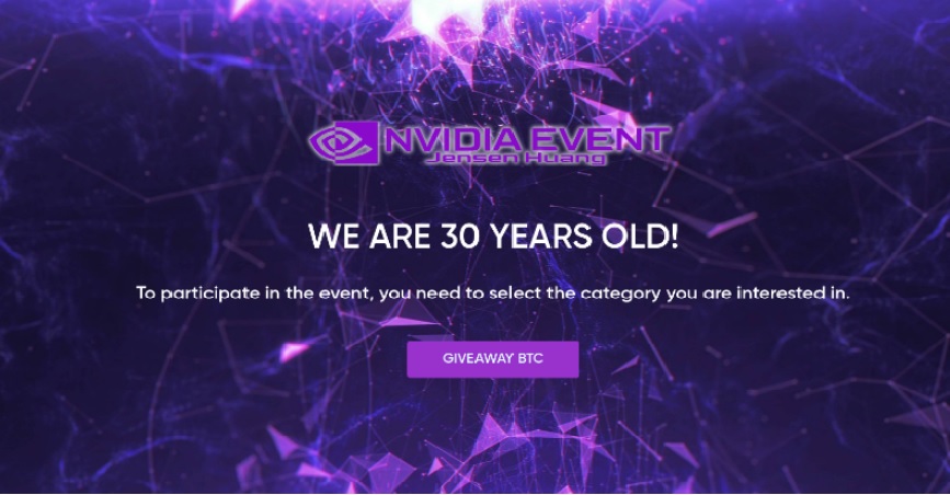 Οι επιτιθέμενοι δημιούργησαν έναν δόλιο ιστότοπο για να τιμήσουν την 30ή επέτειο της εταιρείας, ο οποίος προσκαλούσε τους επισκέπτες να συμμετάσχουν σε έναν διαγωνισμό με έπαθλο 50 χιλιάδες bitcoin. Ωστόσο, οι απατεώνες είχαν κάνει λάθος, χρησιμοποιώντας το λογότυπο της Nvidia σε λάθος χρώμα (βιολετί), ενώ στην πραγματικότητα είναι πράσινο.