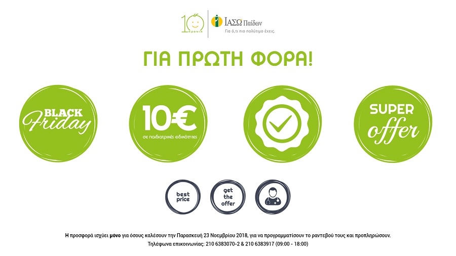 Το ΙΑΣΩ Παίδων, με αφορμή την Black Friday, δείχνει έμπρακτα για ακόμη μία φορά ότι η υγεία των παιδιών είναι ό,τι πιο πολύτιμο και προσφέρει επίσκεψη σε παιδιατρικές ειδικότητες μόνο με 10 ευρώ!