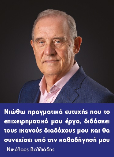 Απάντηση Νικόλαος Βελλιάδης: Νιώθω πραγματικά ευτυχής που το επιχειρηματικό μου έργο, διδάσκει τους ικανούς διαδόχους μου και θα συνεχίσει υπό την καθοδήγησή μου. Είμαι απόλυτα σίγουρος ότι με τη δυναμική που διαθέτουν, τόσο τα παιδιά μου, ο Στέφανος με τη Dominique, όσο και ο κύριος Καλαμπαλίκης και η Διοικητική Ομάδα των εταιρειών, οδηγούν τις εταιρείες μας σε τροχιά ανάπτυξης για τα επόμενα πολλά χρόνια. Τα πρόσφατα παραγωγικά αποτελέσματα, καταδεικνύουν την ανοδική πορεία των εταιρειών μας. Είμαι πεπεισμένος, ότι όποιος συνεργάζεται ή πρόκειται να συνεργαστεί με τις εταιρείες μας, είναι αναπόφευκτο ότι μόνο οφέλη θα απολαμβάνει.