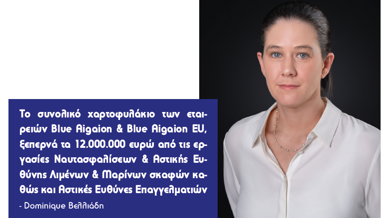 Απάντηση Dominique Βελλιάδη: Το συνολικό χαρτοφυλάκιο των εταιρειών Blue Aigaion & Blue Aigaion EU, ξεπερνά τα 12.000.000 ευρώ από τις εργασίες Ναυτασφαλίσεων & Αστικής Ευθύνης Λιμένων & Μαρίνων Σκαφών καθώς και Αστικές Ευθύνες Επαγγελματιών. Επίσης η Blue Aigaion ασχολείται με ασφαλιστικές εργασίες που αφορούν το Cyber Insurance, Drone Insurance και D & O. Στα επόμενα χρόνια θα είναι μεγαλύτερη ανάγκη για περισσότερους επιχειρηματι- κούς κλάδους, μιας και η ψηφιακή λειτουργία τους θα έχει αυξηθεί περισσότερο από ότι σήμερα, με συνέπεια την ανάγκη ασφαλιστικής κάλυψης. Η εταιρεία μας είναι σχεδόν δεδομένο ότι θα εστιάσει σε τέτοια εξειδικευμένα προϊόντα , αφού ο στόλος των θαλασσίων μέσων που ασφαλίζουμε, δε θα κινδυνεύει μόνο από τους γνωστούς «κλασικούς» κινδύνους. Εμείς παρακολουθούμε στενά, όλες τις εξελίξεις, ώστε να συνεχίζουμε να παρέχουμε στους συνεργάτες που θα επιλέξουν να συνεργαστούμε, την καταλληλότερη λύση. Να σημειώσω επίσης ότι η Blue Aigaion διαθέτει προϊόντα, όπως για παράδειγμα η δυνατότητα ασφαλιστικής κάλυψης Αστικής Ευθύνης πλοίων, κυρίως ημερόπλοιων & Ferry Boats με κεφάλαια