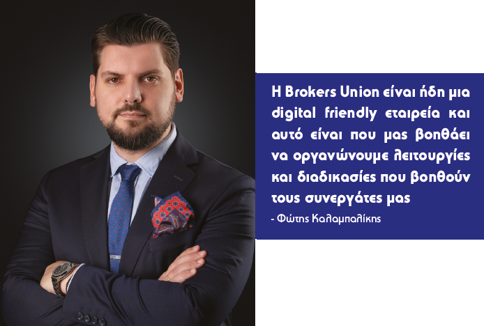 Απάντηση Φώτης Καλαμπαλίκης: Όσον αφορά τη Brokers Union, είμαστε ήδη μια digital friendly εταιρεία και αυτό είναι που μας βοηθάει να οργανώνουμε λειτουργίες και διαδικασίες που βοηθούν τους συνεργάτες μας. Η εξωστρέφειά μας προβάλλεται μέσω των social media, συστηματικά και με συνέπεια. Σε κάθε περίπτωση το business development plan περιλαμβάνει περαιτέρω ψηφιοποίηση των εργασιών μας, μέσω νέων λειτουργιών και εφαρμογών που ετοιμάζουμε και θα προσφέρουμε, στο δίκτυο των συνεργατών μας, από το front portal (Webinsurer) της Brokers Union, μέσω της ανανέωσης και αναδιάρθρωσης του site της Brokers Union, καθώς και μέσω των νέων εφαρμογών που αναπτύσσουμε τόσο για το back office, όσο και για το front office μας.