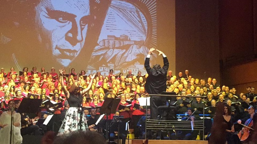 Στην κατάμεστη κεντρική αίθουσα “Χ. Λαμπράκης” του Μεγάρου Μουσικής Αθηνών, τη Δευτέρα 6 Φεβρουαρίου 300 χορωδοί από 10 χορωδίες όλης της χώρας, η θαυμάσια συμφωνική μαντολινάτα, 4 έξοχοι λυρικοί και 2 ερμηνευτές χάρισαν μοναδικές στιγμές μουσικής τέρψης σε ένα ακροατήριο, που τους χειροκρότησε παρατεταμένα και συμμετείχε με ενθουσιασμό. Ήταν όλοι εκεί! Πρόσωπα γνωστά από τη δημόσια ζωή και τις τέχνες, άνθρωποι συνδεδεμένοι με τον σπουδαίο δημιουργό και κυρίως, το πλήθος των ανωνύμων που αναζητούν κάθε ευκαιρία αναβάπτισης στα τραγούδια και τη μουσική του, στο τέλειο ζευγάρωμά της με τους μεγάλους ποιητές.