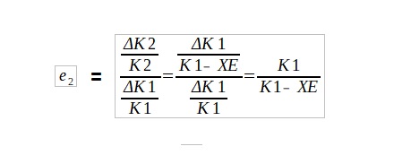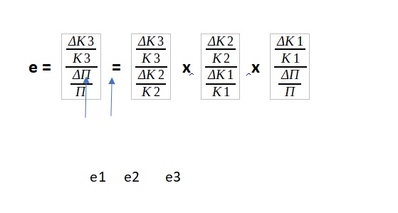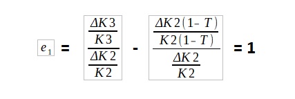 Ο συντελεστής e1 μετρά την ευαισθησία των κερδών μετά από φόρους Κ3 στις μεταβολές των κερδών εκμετάλλευσης πριν από φόρους Κ2. Είναι δυνατό να δειχθεί ότι e1 = 1. Θέτοντας Τ το ποσοστό φορολογίας έχουμε: