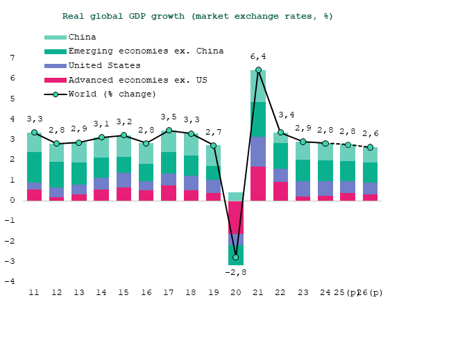 Η δυναμική της παγκόσμιας οικονομίας παρουσιάζει διακυμάνσεις ενόψει του 2026. Αναμένουμε ανάπτυξη +2,6% φέτος – μια πολύ μικρή μείωση σε σχέση με το +2,8% το 2025 – παρά το διεθνές περιβάλλον που χαρακτηρίζεται από επίμονους γεωπολιτικούς, οικονομικούς και κοινωνικούς κινδύνους.