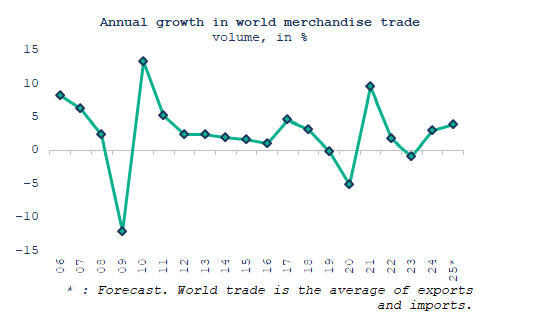 Παρά τις ανησυχίες που προκλήθηκαν από τις δασμολογικές επιθέσεις των ΗΠΑ, το παγκόσμιο εμπόριο εξέπληξε αρκετούς το 2025, με αύξηση 3,9% στον όγκο συναλλαγών λόγω των ισχυρών εισαγωγών από τις ΗΠΑ και αύξηση των τελωνειακών δασμών των ΗΠΑ, η οποία τελικά αποδείχθηκε χαμηλότερη από ό,τι αρχικά φοβόταν. Ο πραγματικός μέσος δασμολογικός συντελεστής ανήλθε στο 9,4% τον Νοέμβριο, σε σύγκριση με το αναμενόμενο 36% στο αποκορύφωμα των εντάσεων με την Κίνα.