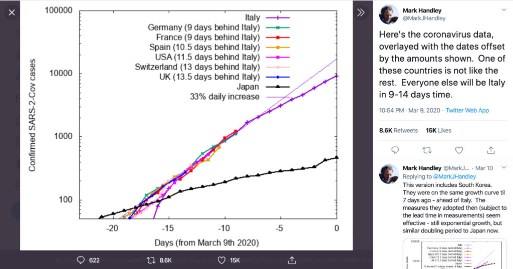 Σύμφωνα με τον Καθηγητή δικτύων & ρομποτικής του πανεπιστημίου UCL, Mark Handley αυτό μπορεί να αποτυπωθεί σε ένα διάγραμμα στο οποίο παίρνοντας σαν δεδομένο την τραγική κατάσταση στην Ιταλία αλλά και την καθημερινή αύξηση των κρουσμάτων μπορούμε να υπολογίσουμε το ποσοστό με το οποίο εξαπλώνετε ο Covid19 σε κάθε χώρα. Σύμφωνα με αυτά τα στοιχεία η Ιταλία λειτουργώντας σε πλήρη lock down μετράει 15.113 κρούσματα με 1.016 θύματα και έχει περιορίσει την εξάπλωση του ιού σε 22% την ημέρα όπως και η Γαλλία και η Γερμανία οι οποίες όμως βρίσκονται 9 με 14 μέρες πίσω από την Ιταλία. Περίπου 2 βδομάδες όμως βρίσκονται και οι υπόλοιπες χώρες τις Ευρώπης που σύμφωνα με το ίδιο διάγραμμα έχουν υψηλότερο ποσοστό διάδοσης του ιού και πιο συγκεκριμένα από 30%.