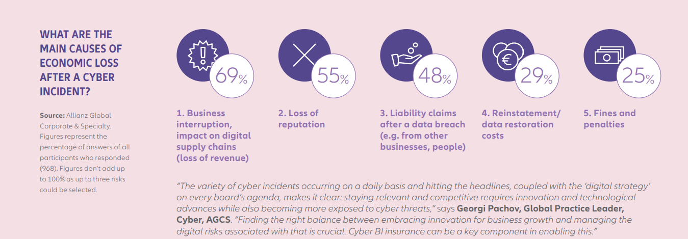 Τόσο οι κίνδυνοι στον κυβερνοχώρο όσο και του BI συνδέονται όλο και περισσότερο καθώς οι επιθέσεις ransomware ή οι τυχαίες διακοπές λειτουργίας των υποδομών πληροφορικής έχουν συχνά ως αποτέλεσμα τη διακοπή λειτουργιών και υπηρεσιών αξίας εκατοντάδων εκατομμυρίων δολαρίων.