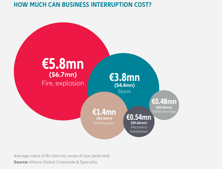Το BI παραμένει η κορυφαία απειλή για τις επιχειρήσεις παγκοσμίως για έβδομη χρονιά και είναι ο μεγαλύτερος κίνδυνος σε χώρες όπως οι ΗΠΑ, ο Καναδάς, η Γερμανία, η Ισπανία, η Ιταλία και η Κίνα. Τα πιθανά σενάρια BI γίνονται ολοένα και πιο ποικίλα και πολύπλοκα σε μια παγκόσμια συνδεδεμένη οικονομία και συμπεριλαμβάνοντας την κατάρρευση των βασικών συστημάτων πληροφορικής, τις αποσύρσεις προϊόντων ή ζητήματα ποιότητας, την τρομοκρατία ή τις πολιτικές αναταραχές ή την περιβαλλοντική ρύπανση.