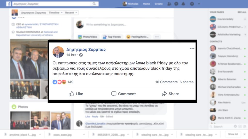 Με ένα σχόλιό του στην ιστοσελίδα του στο Facebook ο Δημήτρης Ζορμπάς, Διευθύνων Σύμβουλος της Συνεταιριστικής Ασφαλιστικής τοποθετήθηκε επίσημα για τις εκπτώσεις λόγω Black Friday στα ασφαλιστήρια συμβόλαια κατοικίας και αυτοκινήτου.