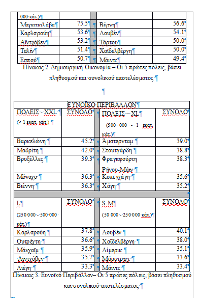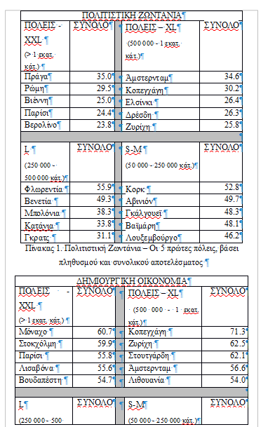 Ενδεικτικά, σύμφωνα με το χάρτη της πιο πρόσφατης έκδοσης (2019) του Παρατηρητηρίου στο πεδίο της πολιτιστικής ζωντάνιας, στην πρώτη πεντάδα των πόλεων, που χαρακτηρίζονται ως XXL (με πληθυσμό, που υπερβαίνει το 1 εκατ. κατοίκους), βρίσκονται η Πράγα, η Ρώμη, η Βιέννη, το Παρίσι και το Βερολίνο. Στο αντίστοιχο πεδίο, στην πρώτη πεντάδα των πόλεων, που χαρακτηρίζονται ως S-M (με πληθυσμό από 50.000 έως 250.000 κατοίκους), συναντώνται το Κορκ, η Αβινιόν, το Γκάλγουεϊ, η Βαϊμάρη και το Λουξεμβούργο. Στους πίνακες 1, 2 και 3, που ακολουθούν, παρουσιάζεται μια συνοπτική εικόνα των πόλεων, που βάσει των επιδόσεών τους στα πεδία της «πολιτιστικής ζωντάνιας», της «δημιουργικής οικονομίας» και του «ευνοϊκού περιβάλλοντος», με πληθυσμιακά κριτήρια, βρίσκονται στις πέντε πρώτες θέσεις της πρόσφατης έκδοσης του Παρατηρητηρίου.