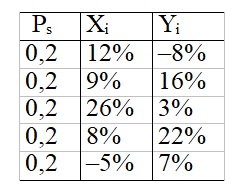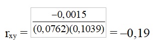COV(X,Y) = 0,2(0,12–0,10) (–0,08–0,08) + 0,2(0,09–0,10) (0,16–0,08) + 0,2(0,26–0,10) (0,03–0,08) + 0,2(0,08–0,10) (0,22–0,08) + 0,2(–0,05–0,10) (0,07–0,08) = –0,0015