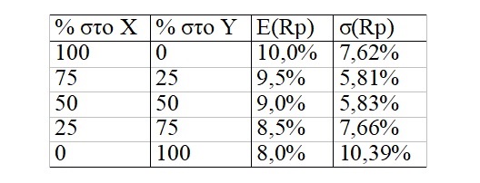 Υπάρχουν βέβαια και άλλοι συνδυασμοί των χρεογράφων Χ και Υ που σχηματίζουν χαρτοφυλάκια. Ο παρακάτω πίνακας παρουσιάζει την αναμενόμενη απόδοση και τον κίνδυνο αυτών των χαρτοφυλακίων.