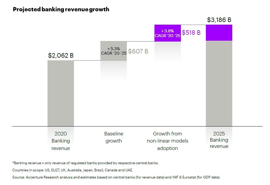 Πολλές από τις κορυφαίες τράπεζες που αναλύονται στη μελέτη υιοθετούν γραμμικά (παραδοσιακά) επιχειρηματικά μοντέλα. Ωστόσο, η μελέτη διαπιστώνει ότι όσες τράπεζες αποδεσμεύσουν τα παραδοσιακά τραπεζικά προϊόντα τους και συνεργαστούν με τρίτες εταιρείες για την ανάπτυξη και προσφορά νέων εξατομικευμένων λύσεων, μπορούν δυνητικά να επιτύχουν μεγαλύτερη ανάπτυξη και υψηλότερες αποτιμήσεις στην αγορά. Συγκεκριμένα, αξιοποιώντας μη γραμμικά επιχειρηματικά μοντέλα, οι τράπεζες θα μπορούσαν να ενισχύσουν τον ετήσιο ρυθμό ανάπτυξής τους έως και 3,8%, γεγονός το οποίο θα οδηγούσε σε επιπλέον έσοδα ύψους 518 δισεκατομμυρίων δολαρίων έως το 2025.