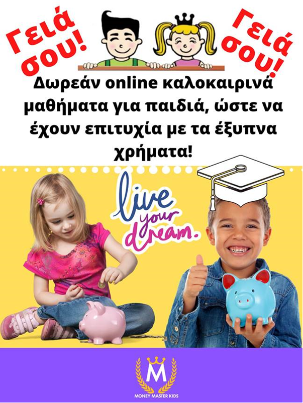 Πρόκειται για κύκλο εκπαιδευτικών ψηφιακών σεμιναρίων που θα διεξάγονται από την Ελληνική εθελοντική ομάδα του Money Μaster Kids και απευθύνεται σε παιδιά από 5 έως 10 χρονών.