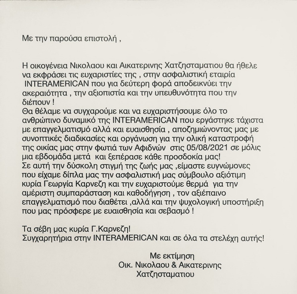 Είναι χαρακτηριστικό ότι για τις πυρκαγιές του Αυγούστου πληρώθηκαν εντός του μήνα 500.000 ευρώ, με την πρώτη αποζημίωση (145.000 ευρώ) να καταβάλλεται για κατοικία την τρίτη ημέρα από την καταστροφή της. Η πληγείσα οικογένεια Ν. Χατζησταματίου εκφράζει δημόσια τις ευχαριστίες της για την αμεσότητα και την ταχύτητα έκδοσης της αποζημίωσης, υπογραμμίζοντας σε επιστολή της την αξιοπιστία και υπευθυνότητα της INTERAMERICAN, καθώς και την επαγγελματική συνέπεια της ασφαλιστικής συμβούλου Γ. Καρνέζη, που συνέτρεξε από την πρώτη στιγμή.