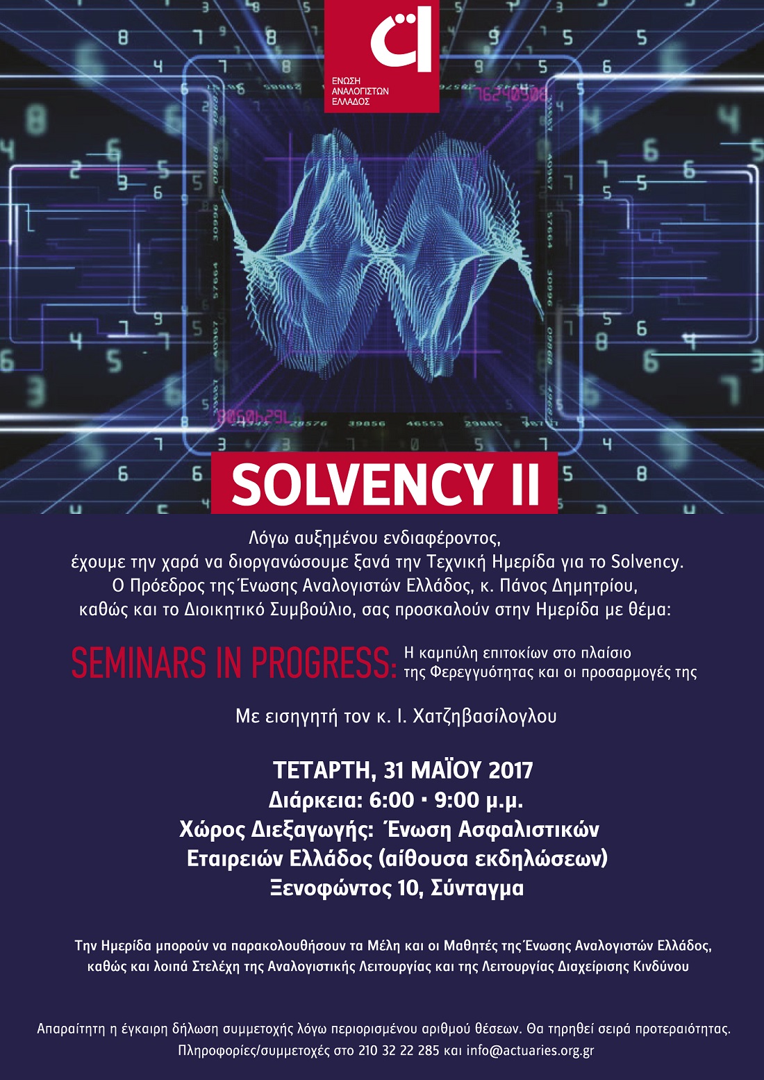 Η επιτυχία που σημείωσε προ ολίγων ημερών η Τεχνική Ημερίδα για το Solvency ΙΙ με εισηγητή τον κ. Ι. Χατζηβασίλογλου καθώς και το αυξημένο ενδιαφέρον για επανάληψή της προκειμένου να την παρακολουθήσουν περισσότεροι ενδιαφερόμενοι, μας δίνει τη χαρά να σας προσκαλέσουμε ξανά, στην εξής διοργάνωση: