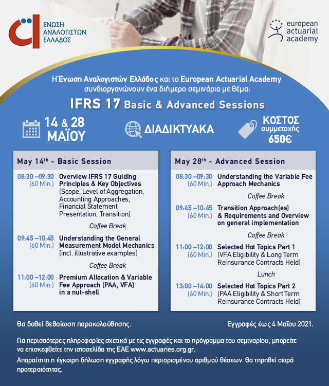 Η Ένωση Αναλογιστών Ελλάδος (ΕΑΕ) σε συνεργασία με την European Actuarial Academy (EAA) θα διοργανώσουν ένα εκπαιδευτικό σεμινάριο με θέμα «IFRS 17 Basic & Advanced Sessions», το οποίο θα πραγματοποιηθεί διαδικτυακά στις 14 & 28 Μαΐου 2021.