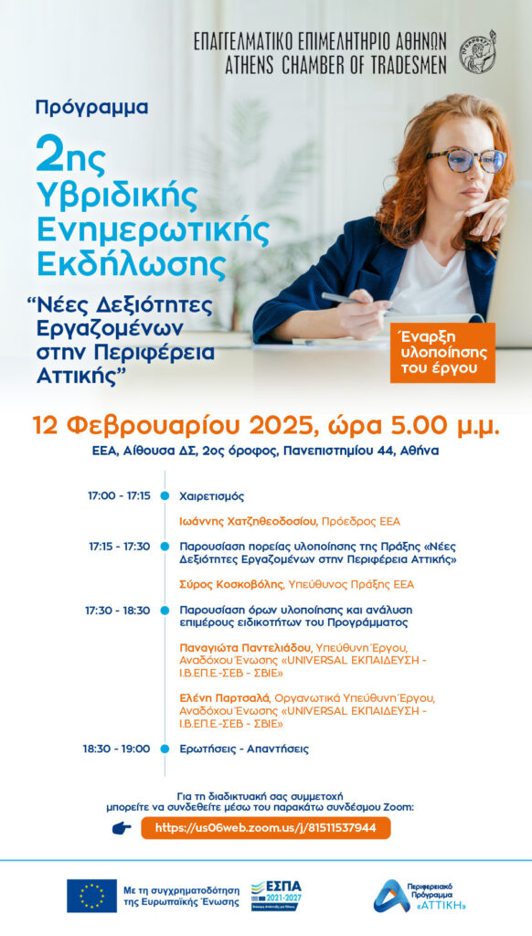 Το Επαγγελματικό Επιμελητήριο Αθηνών (ΕΕΑ) διοργανώνει την 2η Υβριδική Ενημερωτική Ημερίδα στο πλαίσιο του προγράμματος “Νέες Δεξιότητες Εργαζομένων στην Περιφέρεια Αττικής” (ΟΠΣ 6004268).