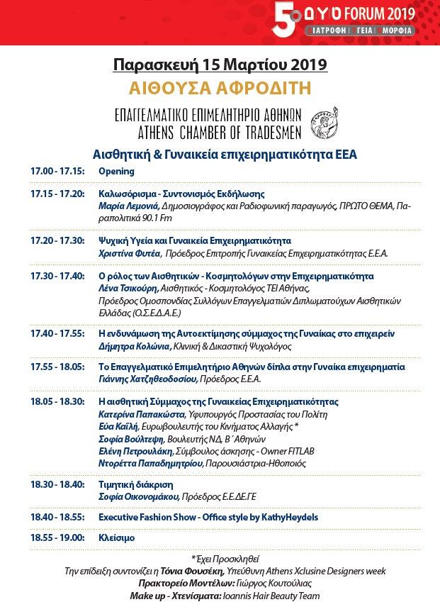 Σε μία ακόμη πρωτοβουλία με επίκεντρο τις Γυναίκες Επιχειρηματίες προχωρούν το Επαγγελματικό Επιμελητήριο Αθηνών και η Επιτροπή Γυναικείας Επιχειρηματικότητας του Ε.Ε.Α. Την Παρασκευή 15 Μαρτίου 2019 και ώρα 17:00 – 19:00 διοργανώνουν Ημερίδα με θέμα «Η αισθητική σύμμαχος της Γυναικείας Επιχειρηματικότητας», στο πλαίσιο του ΔΥΟ Forum, Διατροφή, Υγεία, Ομορφιά και της Beauty Day, στο Ζάππειο Μέγαρο, αίθουσα «Αφροδίτη».