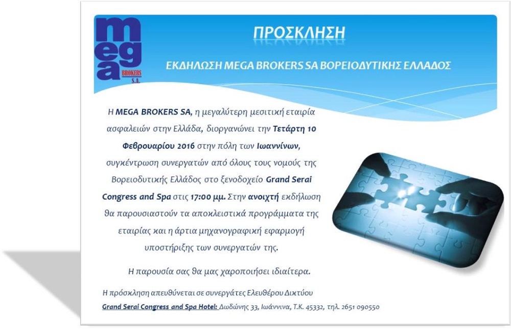 Η Mega Brokers SA διοργανώνει αύριο Τετάρτη 10 Φεβρουαρίου 2016 στα Ιωάννινα συγκέντρωση συνεργατών από όλους τους νομούς της Βορειοδυτικής Ελλάδας.