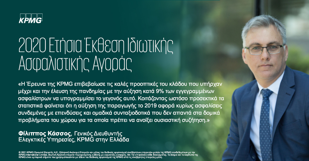 Σύμφωνα με τον Φίλιππο Κάσσο, Γενικό Διευθυντή στο Τμήμα Ελέγχου της KPMG «η Έρευνα της KPMG επιβεβαίωσε τις καλές προοπτικές του κλάδου που υπήρχαν μέχρι και την έλευση της πανδημίας με την αύξηση κατά 9% των εγγεγραμμένων ασφαλίστρων να υπογραμμίσει το γεγονός αυτό.