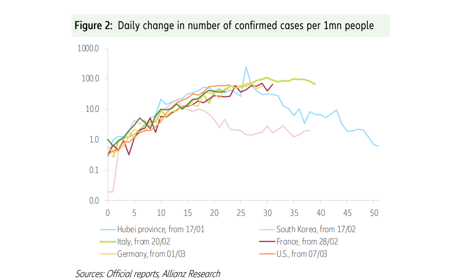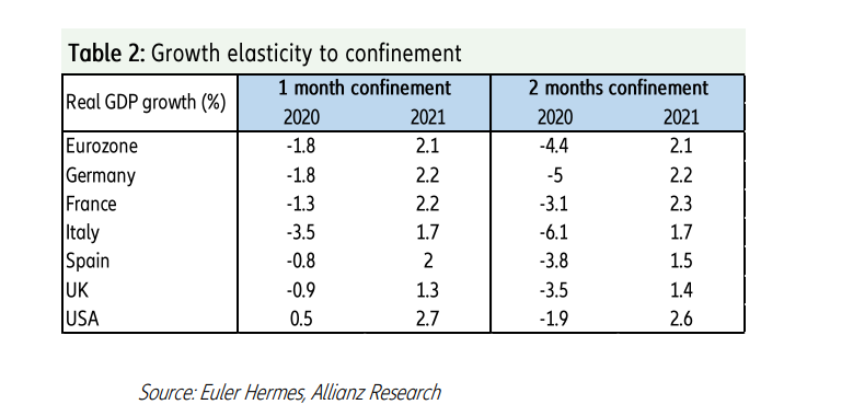 Για να μελετήσουν τις πιθανές επιπτώσεις των μέτρων περιορισμού της κυκλοφορίας οι οικονομολόγοι της Allianz επανεξέτασαν τα στοιχεία Ιανουαρίου-Φεβρουαρίου από την Κίνα, η οποία ήταν η πρώτη που επλήγη από τον παθογόνο παράγοντα. Τα στοιχεία έδειξαν ότι ένας μήνας περιορισμού των ανθρώπων προκάλεσε μείωση 13% στις καταναλωτικές δαπάνες, μείωση κατά 20% στις επενδύσεις και πτώση κατά 16% στις εξαγωγές.