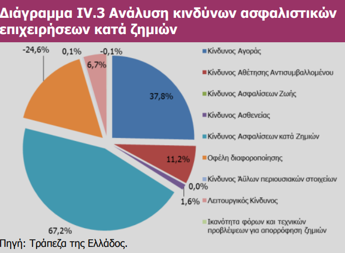 Ο κίνδυνος αγοράς αφορά κυρίως τους κινδύνους μετοχών και πιστωτικών περιθωρίων, ενώ ο ασφαλιστικός κίνδυνος αφορά κυρίως τον κίνδυνο ασφαλίσεων κατά ζημιών. Σημειώνεται ότι όλοι οι κίνδυνοι προέρχονται από την ανάλυση της καθαρής Κεφαλαιακής Απαίτησης Φερεγγυότητας των ασφαλιστικών επιχειρήσεων κατά το 2018, μετά την επίπτωση της αντασφάλισης, η οποία είναι σημαντική κυρίως για τους καταστροφικούς κινδύνους (κλάδοι πυρός-σεισμού).
