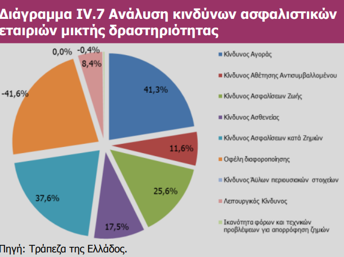 ν (ασφαλιστικές εταιρίες μικτής δραστηριότητας), η συνεισφορά των διαφόρων κινδύνων στο προφίλ των κινδύνων τους διαφοροποιείται σημαντικά. Ο μεγαλύτερος κίνδυνος είναι αυτός της αγοράς καθώς συνεισφέρει κατά 41,3% (από 41,8% το προηγούμενο έτος), ενώ οι ασφαλιστικοί κίνδυνοι κατά ζημιών, ζωής και ασθενείας συνεισφέρουν με ποσοστό 37,6%, 25,6% και 17,5% (τα ποσοστά αυτά βρίσκονται σε παρόμοιο επίπεδο με τα αντίστοιχα το προηγούμενο έτος) (Διάγραμμα IV.7). Επιπλέον, ο κίνδυνος αθέτησης αντισυμβαλλομένου κινείται σε υψηλά επίπεδα, αν και είναι μειωμένος σε σχέση με τα προηγούμενα έτη (περίπου 11,6%, από 12,5% το 2017 και 15% το 2016). Τα οφέλη από τη διαφοροποίηση είναι αρκετά σημαντικά (μειώνουν τον κίνδυνο κατά 41,6% περίπου), καθώς οι επιχειρήσεις αυτές έχουν μεγαλύτερες δυνατότητες ανάληψης ασυσχέτιστων ή και, σε ορισμένες περιπτώσεις, αρνητικά συσχετισμένων κινδύνων.