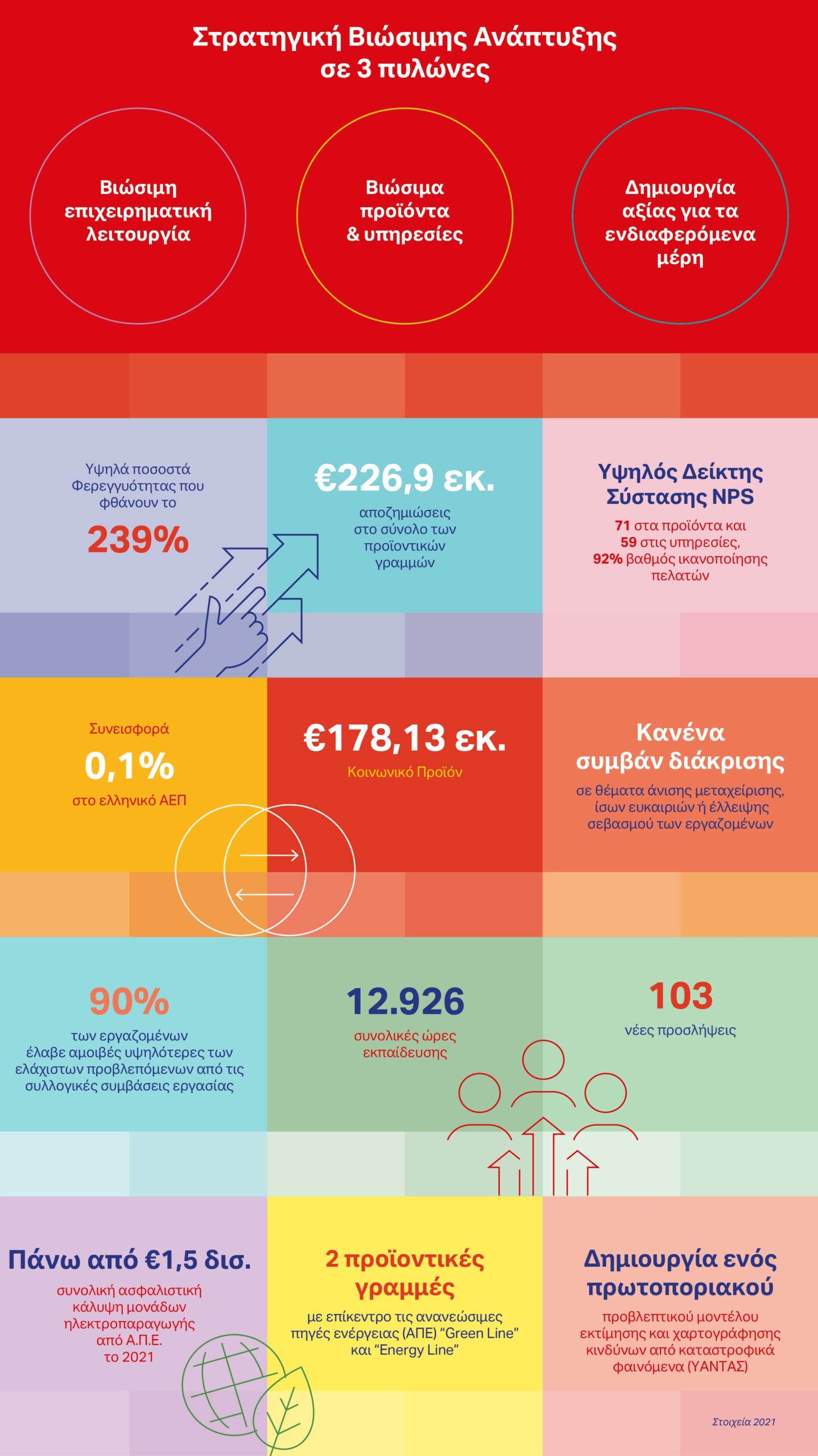 Συγκεκριμένα, η Έκθεση Βιώσιμης Ανάπτυξης αναπτύσσεται σε τρεις βασικούς πυλώνες, τη Βιώσιμη Επιχειρηματική Λειτουργία, τα Βιώσιμα Προϊόντα και τις Υπηρεσίες και τη Δημιουργία Αξίας για τα ενδιαφερόμενα μέρη, που αποτελούν τη στρατηγική βιώσιμης ανάπτυξης του ομίλου. Το περιεχόμενο έχει αναπτυχθεί σύμφωνα τα ανανεωμένα πρότυπα GRI Reporting Standards 2021, ακολουθώντας την επιλογή “In accordance” και ενσωματώνοντας τα “GRI reporting principles”, τον Οδηγό Δημοσιοποίησης Πληροφοριών ESG του Χρηματιστηρίου Αθηνών, το πρότυπο AA1000 Accountability Principles Standard, ενώ οι επιδράσεις της Εταιρείας έχουν αντιστοιχηθεί με τους 17 Στόχους Βιώσιμης Ανάπτυξης των Ηνωμένων Εθνών.