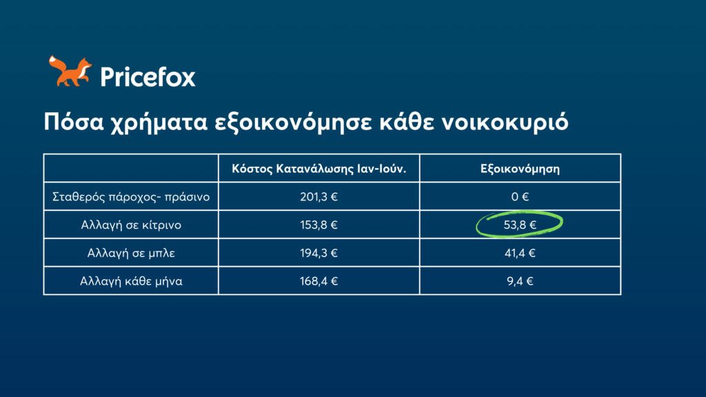 Το νοικοκυριό που άλλαξε πρόγραμμα από την αρχή του χρόνου μπορεί να κερδίσει έως και 129 € μέχρι τέλους του έτους σε σύγκριση με το νοικοκυριό που παρέμεινε στο ειδικό πρόγραμμα του κύριου παρόχου.
