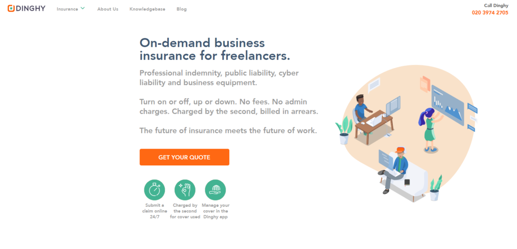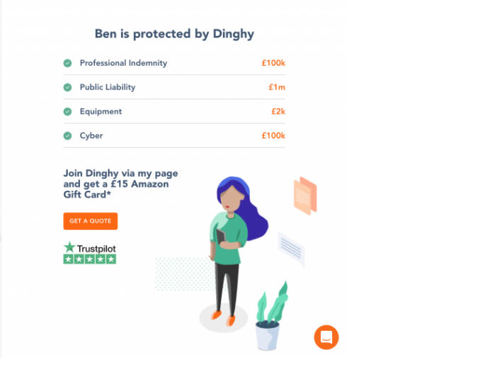 Η Dinghy απευθύνεται σε ελεύθερους επαγγελματίες στη Βρετανία και λειτουργεί 24 ώρες τη μέρα και 7 μέρες την εβδομάδα, καλύπτοντας για όσο χρόνο θέλουν την αστική ευθύνη, την επαγγελματική αστική ευθύνη, την ευθύνη να απώλειας data πελατών και τον επαγγελματικό εξοπλισμό.