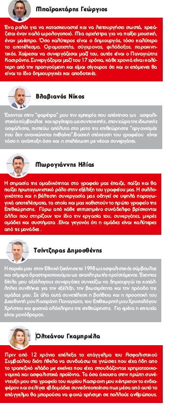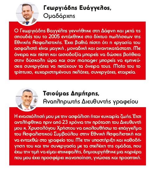 Κινητήριος δύναμη του γραφείου είναι οι άνθρωποί του, οι ασφαλιστές, καθώς και οι Καρύδη Λένα, Χρηστάκου Ιωάννα, Σπανάκη Βάσω και Γάτσιου Μάχη, που είναι επιφορτισμένες με τη γραμματειακή υποστήριξη. Ανάμεσα στους συνεργάτες Κορυφαία Ασφαλιστική σύμβουλος είναι η Αντωνοπούλου Ευθυμία, χρόνια ψηλά παραγωγικά στάνταρ καταγράφει ο Καφούρος Ελευθέριος και φερέλπιδο μέλλον ο Τζίτζης Στυλιανός.