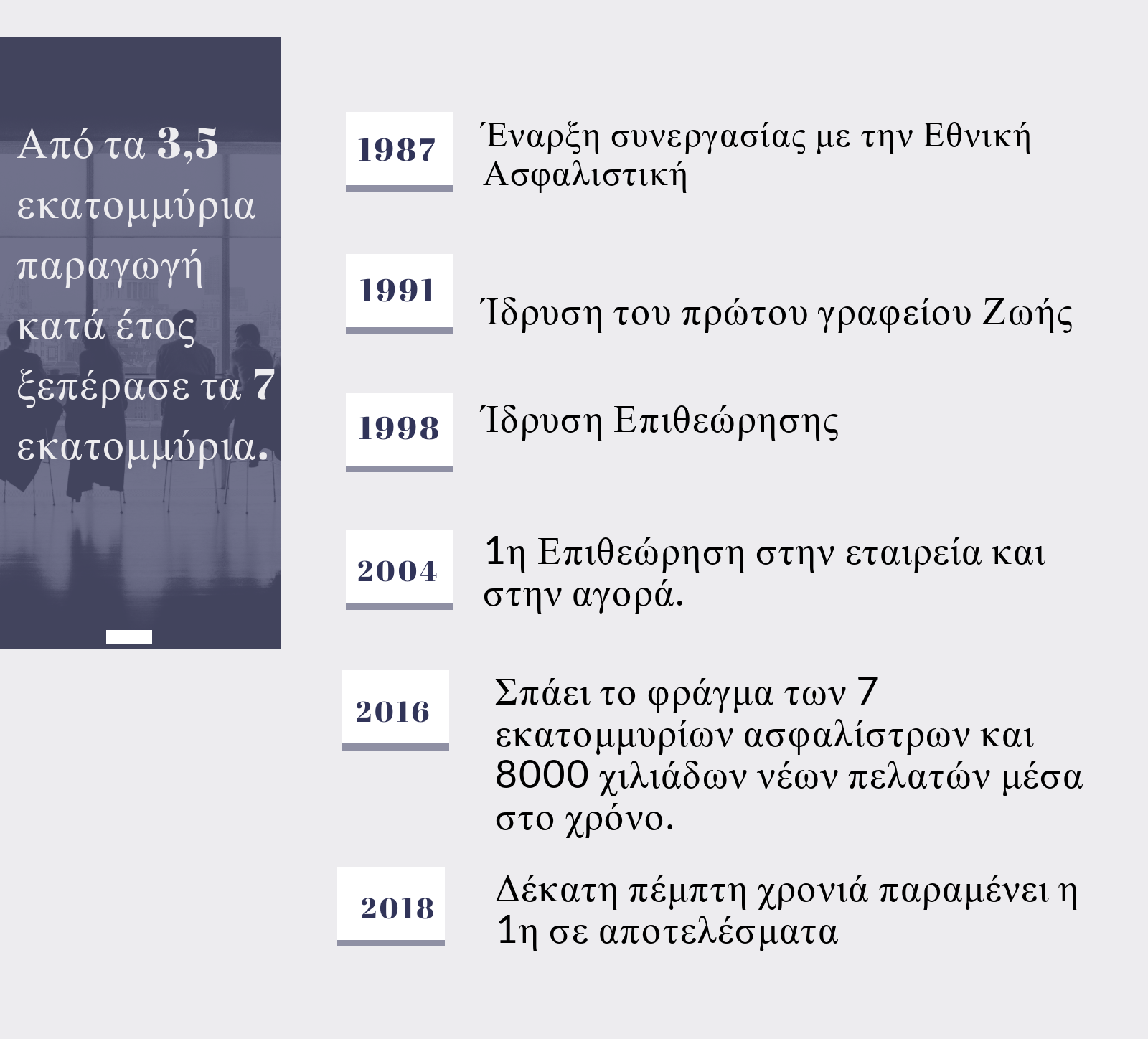 Στην πράξη έχει διαφανεί ότι η τροχιά που διαγράφει τα τελευταία 15 χρόνια χαρακτηρίζεται από την κατάρριψη ρεκόρ και την επίτευξη στόχων, που την καθιστούν την πρώτη σε αποτελέσματα επιθεώρηση της Εθνικής Ασφαλιστικής. Το χαρτοφυλάκιο της αριθμεί 95.000 πελάτες και η διατηρισιμότητα για το 2018 ανήλθε στο 90,61% με μέσο όρο δεκαετίας το 89,16%.