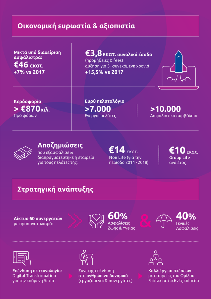 Τα μικτά υπό διαχείριση ασφάλιστρα για το 2018 ανήλθαν στα €46 εκατ., σημειώνοντας αύξηση 7,1% σε σύγκριση με το 2017, παρουσιάζοντας σταθερά ανοδική πορεία από το 2014 και καταγράφοντας το υψηλότερο της τελευταίας πενταετίας. Ανοδικά κινήθηκε και σε επίπεδο αποζημιώσεων, καθώς κατά τη διάρκεια της προηγούμενης χρονιάς διαπραγματεύτηκε και εξασφάλισε για τους πελάτες της συνολικές αποζημιώσεις που ξεπέρασαν τα €10 εκατ. στις ασφαλίσεις Ζωής, Υγείας και Γενικές Ασφαλίσεις.