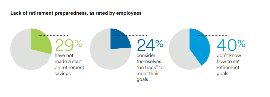 Ακόμα, από τη σκοπιά των εργαζομένων, τα δεδομένα της αγοράς έχουν μεταβάλει άρδην τις ανάγκες τους. Σύμφωνα με τα ευρήματα της έρευνας, το 40% των εργαζομένων δεν ξέρει πώς να σχεδιάσει τη συνταξιοδότησή του και το 29% δεν έχει κάνει κάποια κίνηση για να αποταμιεύσει χρήματα.