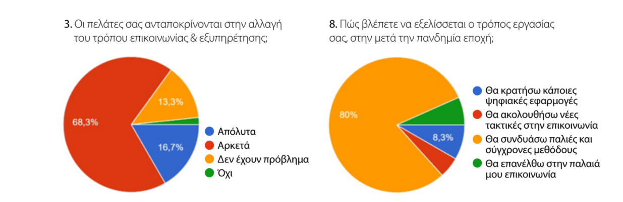 Βάσει των στοιχείων που κατέγραψε η ΕΕΑΕ, μετά από 1,5 χρόνο υγειονομικής κρίσης και περιορισμού της παραδοσιακής επικοινωνίας με τον καταναλωτή, το 80% των ασφαλιστών αναφέρει ότι μετά την πανδημία στην εργασία του θα συνδυάζει παλιές και σύγχρονες μεθόδους, το 8,3% αναφέρει ότι θα διατηρήσει κάποιες ψηφιακές εφαρμογές και το υπόλοιπο 11,7% θα επανέλθει στον παραδοσιακό τρόπο επικοινωνίας ή θα ακολουθήσει νέες τακτικές στην επικοινωνία.