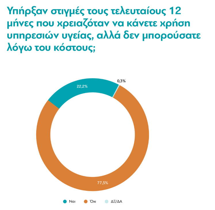 Όσον αφορά το 22% που δεν μπόρεσε μέσα στο 2023 να έχει πρόσβαση σε ιατρική υπηρεσία ή φάρμακα που χρειάστηκε, φαίνεται ότι εκείνοι που έχουν διαγνωστεί με χρόνιο πρόβλημα υγείας, είναι κατά 48% πιο πιθανό να μην μπορούν να κάνουν χρήση των υπηρεσιών υγείας λόγω κόστους.