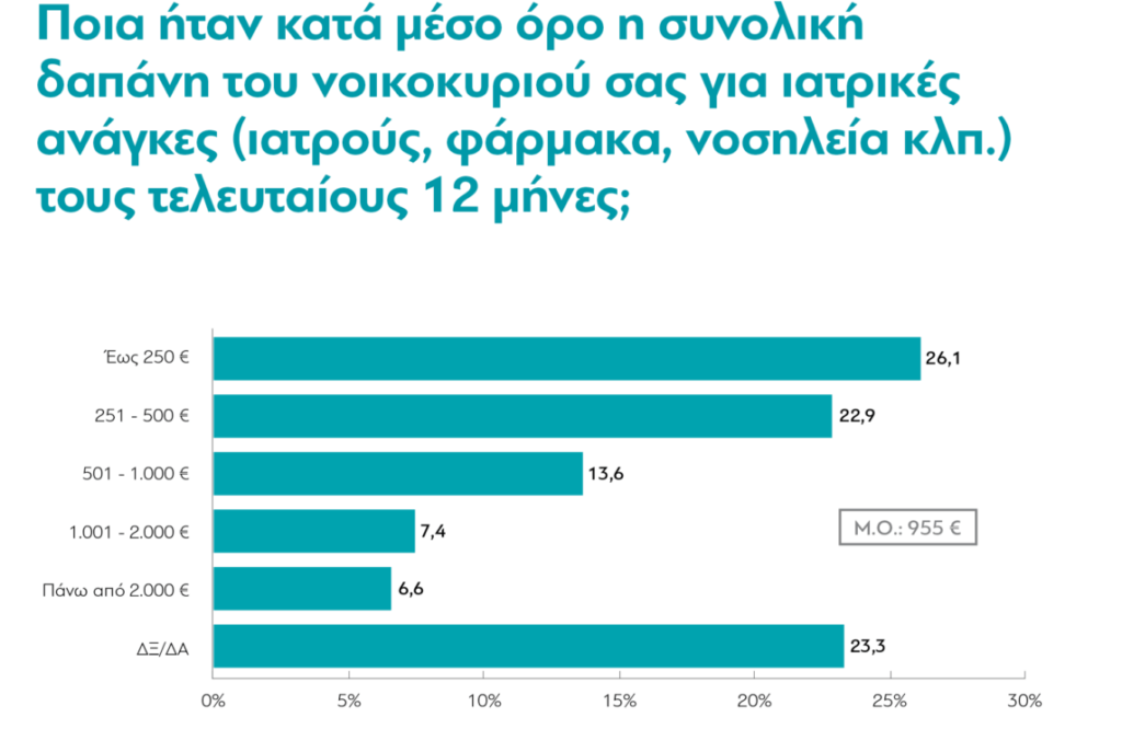 Η έρευνα που έγινε στα τέλη του Δεκεμβρίου του 2023 αποκαλύπτει επίσης ότι περίπου 1 στους 7, το 14%, ξόδεψαν περισσότερο από 1.000 ευρώ για υπηρεσίες υγείας μέσα στο χρόνο που πέρασε.