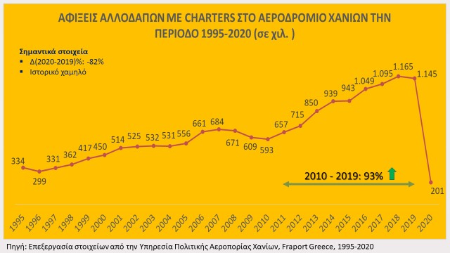 Σχετικά με τις αφίξεις αλλοδαπών τουριστών στο αεροδρόμιο Χανίων και με βάση τα στοιχεία της Fraport-Greece για το έτος 2020, σημειώνονται μόλις 200 χιλιάδες αφίξεις, καταγράφοντας μία κατακόρυφη μείωση της τάξεως του 82% σε σχέση με το προηγούμενο έτος, αριθμός που αποτελεί ιστορικό χαμηλό τουλάχιστον κατά τα τελευταία 25 έτη.