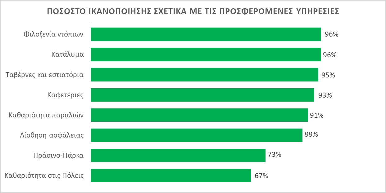 Όσον αφορά τις προσφερόμενες υπηρεσίες, τα ποσοστά ικανοποίησης των αλλοδαπών τουριστών αναφορικά με τη φιλοξενία και τη συμπεριφορά των ντόπιων κατοίκων, τους χώρους φιλοξενίας και εστίασης, την καθαριότητα παραλιών και την αίσθηση ασφάλειας παραμένουν σε πολύ υψηλά επίπεδα, με ελαφρώς υψηλότερα ποσοστά σε σχέση με την προηγούμενη περίοδο. Οι υπηρεσίες που χρήζουν κάποιας βελτίωσης είναι η καθαριότητα στον αστικό ιστό των πόλεων καθώς και οι χώροι πράσινου και πάρκων, για τους οποίους οι αλλοδαποί τουρίστες συνεχίζουν να εκφράζουν λιγότερο την ικανοποίηση τους, αλλά με καλύτερα ποσοστά σε σχέση με πέρυσι.