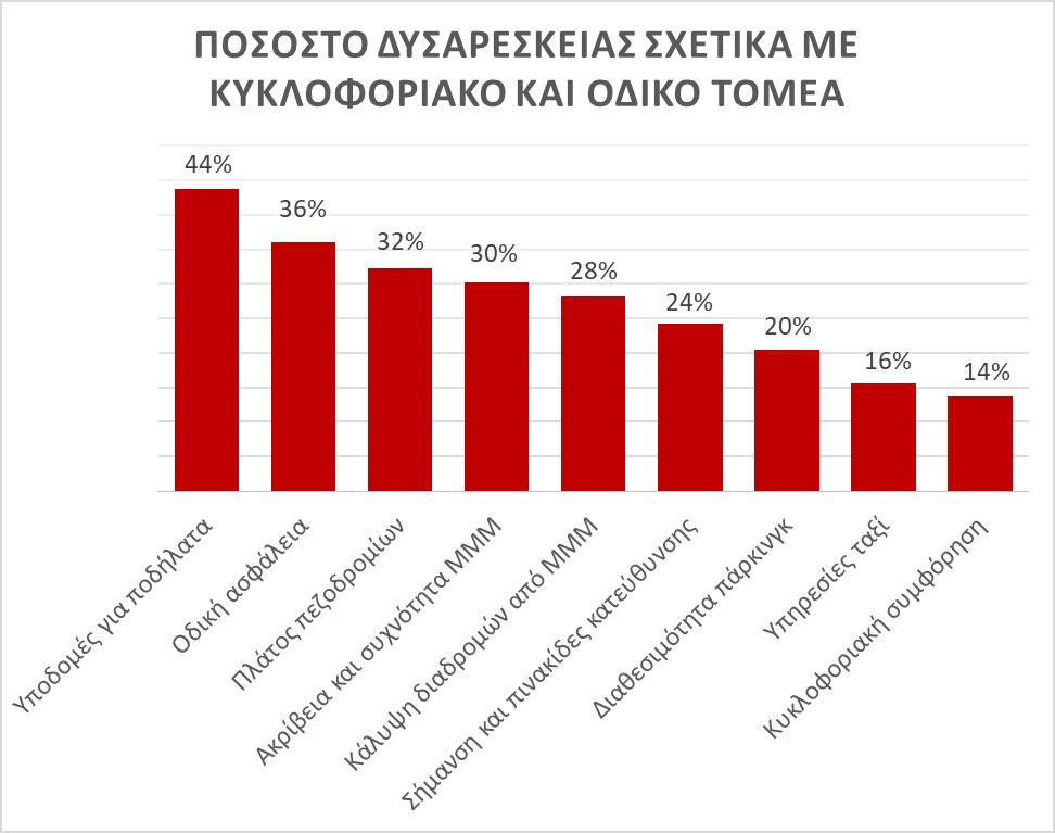 Αναφορικά με το κυκλοφοριακό και τον οδικό τομέα, η κυκλοφοριακή συμφόρηση καθώς και οι υπηρεσίες ταξί συγκεντρώνουν τα χαμηλότερα ποσοστά δυσαρέσκειας, ενώ οι υποδομές που χρήζουν άμεσης αναβάθμισης, είναι πρωτίστως οι υποδομές που αφορούν τους ποδηλατόδρομους και την οδική ασφάλεια (οδόστρωμα, κλίσεις, στροφές), όπου παρουσιάζονται μεγάλα ποσοστά δυσαρέσκειας, 44% και 36%, αντίστοιχα. Υψηλό ποσοστό δυσαρέσκειας, εμφανίζεται σχετικά με τη διαπλάτυνση των πεζοδρομίων, παρόλο που υπάρχει σημαντική βελτίωση το τελευταίο έτος, αλλά και στην ακρίβεια, συχνότητα και κάλυψη διαδρομών από τα Μέσα Μαζικής Μεταφοράς, το οποίο είναι κατά πολύ αυξημένο σε σχέση με την προηγούμενη χρονιά. Αυτό δικαιολογείται όμως από το χαμηλό αριθμό αφίξεων αλλοδαπών τουριστών, όπως και από τους κανόνες πληρότητας που θα έπρεπε να τηρούν τα ΜΜΜ για την υγειονομική ασφάλεια των επιβατών, γεγονός που δεν επέτρεψε την επαρκή κάλυψη δρομολογίων, καθώς και την τήρηση της ακρίβειας και συχνότητας των ΜΜΜ. Η σήμανση καθώς και οι πινακίδες κατεύθυνσης του οδικού δικτύου χρήζουν επίσης ανάγκη βελτίωσης, όπως και η ύπαρξη περισσότερων θέσεων πάρκινγκ.